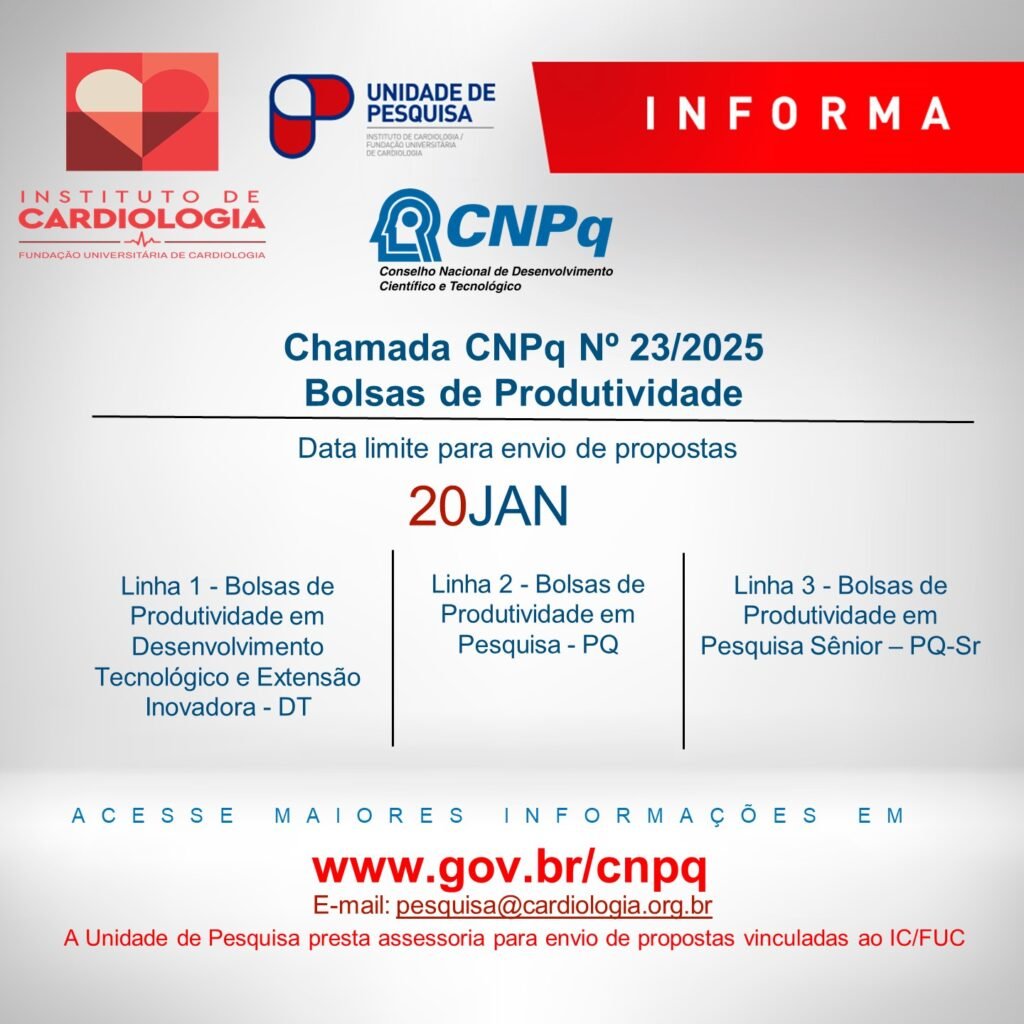 Voltar Para Notícias Chamada CNPq – Bolsas de Produtividade até 20/01/2026 Chamada CNPq – Bolsas de Produtividade até 20/01/2026 03/12 Compartilhe Acesse a chamada ao edital Voltar Para Notícias Próxima notícia