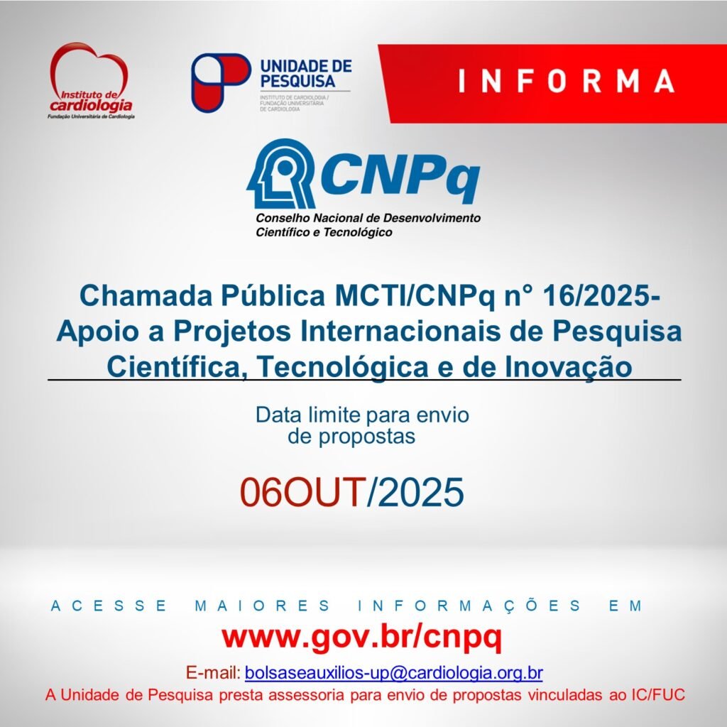 Voltar Para Notícias Chamada Pública MCTI/CNPq n° 16/2025- Apoio a Projetos Internacionais de Pesquisa Científica, Tecnológica e de Inovação Chamada Pública MCTI/CNPq n° 16/2025- Apoio a Projetos Internacionais de Pesquisa Científica, Tecnológica e de Inovação 28/08 Compartilhe Acesse a chamada ao edital Voltar Para Notícias Próxima notícia